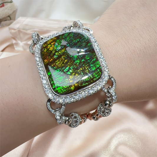 斑彩石(Ammolite,又稱斑彩螺化石)是一種由菊石(ammonite 化石)演變而來的寶石,表面呈現虹彩光澤,呈現紅、橙、黃、綠、藍、靛、紫等多色變化,因色彩斑斕而得名。